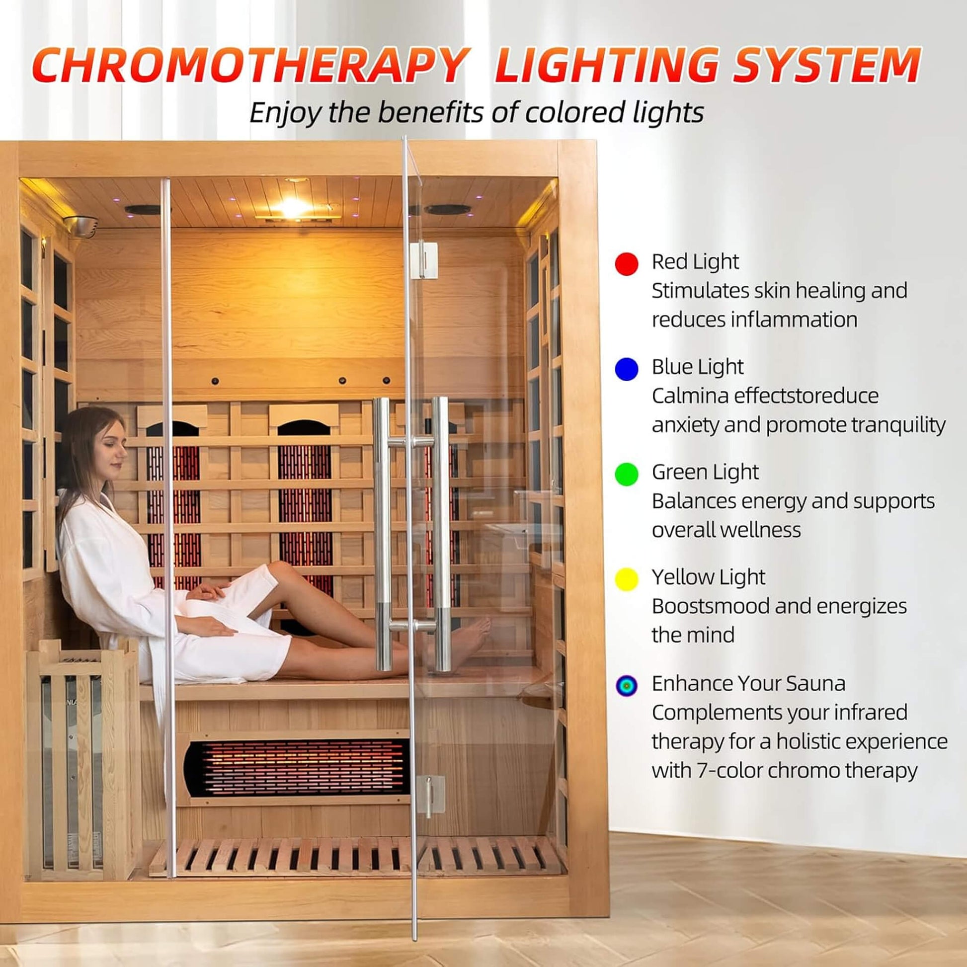 Your ultimate relaxation is just a touch away. The smart control panel makes it easy to adjust temperature, while the 7-color chromotherapy lighting lets you set the perfect mood for your session. Enhance your experience even further with the built-in Bluetooth speaker to play calming music and the integrated oxygen bar for a refreshing atmosphere. With the Rövia Aurora, you aren’t just buying a sauna; you are investing in a versatile and luxurious escape that will leave you feeling refreshed, revitalized, and ready to take on the world.