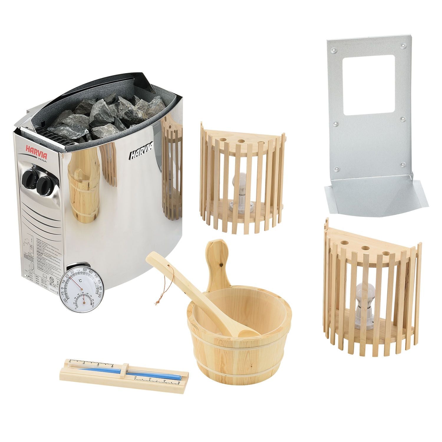 • Sauna accessory set (wooden bucket, large wooden spoon, sand timer & thermometer, sauna stones)