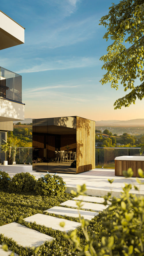 The Spectra is a compact, design-forward outdoor sauna that blends bold aesthetics with restorative wellness. Its sleek, single-glazed facade—available in natural or black wood—complements any garden setting. It’s a modern statement piece built for all-season use.